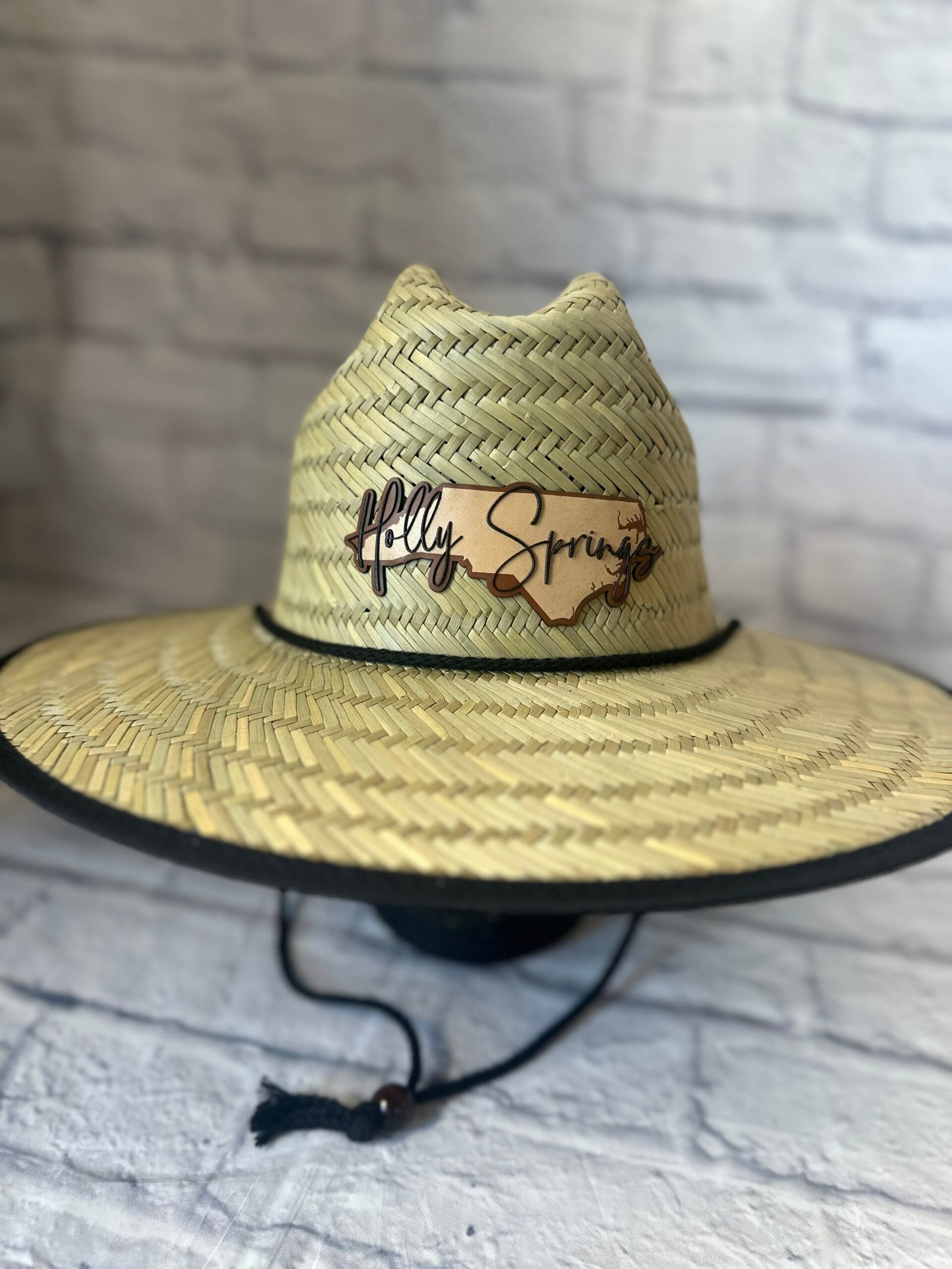 A breathable straw hat featuring a raised embroidered Holly Springs patch. Lightweight, adjustable, and perfect for sunny days with local pride.